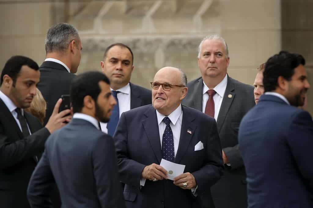WASHINGTON, DC – SEPTEMBER 1: Rudy Giuliani (C) arrives at the Washington National Cathedral for the funeral service for the late Senator John McCain, September 1, 2018 in Washington, DC. Former presidents Barack Obama and George W. Bush are set to deliver eulogies for McCain in front of the 2,500 invited guests. McCain will be buried on Sunday at the U.S. Naval Academy Cemetery. (Photo by Drew Angerer/Getty Images)