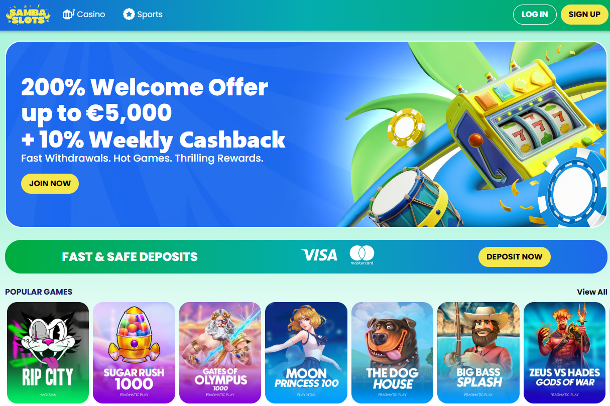 Samba Slots je nov igralec na trgu, ki že osvaja pozornost s svojo enostavno, mobilno optimizirano platformo za športne stave. Novi igralci prejmejo 200 % bonus in 50 brezplačnih vrtljajev.